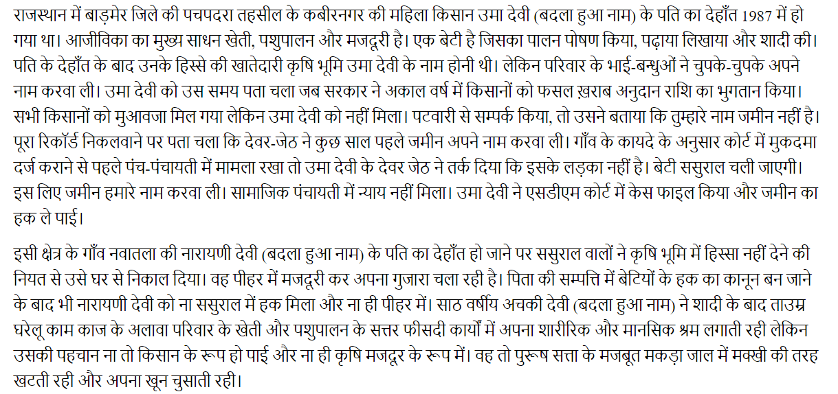 भारतीय मानव विकास सर्वेक्षण (IHDS, 2018) के अनुसार, देश में 83 प्रतिशत कृषि भूमि पुरुष सदस्यों को विरासत में मिली है, जबकि केवल दो प्रतिशत महिलाओं के नाम पर पंजीकृत है।