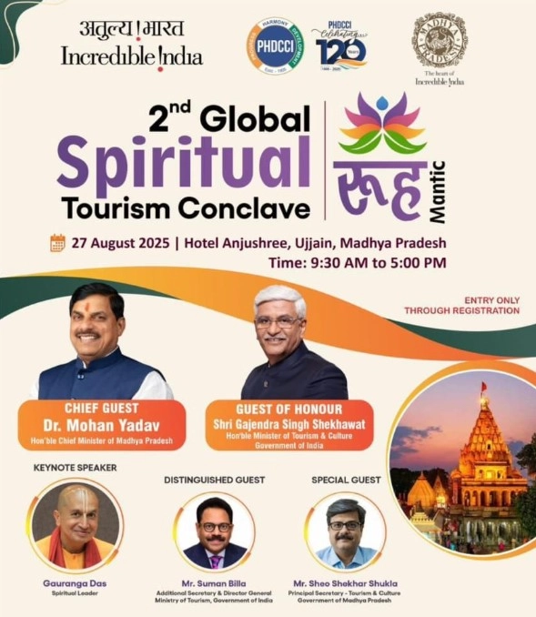 महाकाल की पवित्र नगरी उज्जैन में 27 अगस्त 2025 को प्रदेश के द्वितीय वैश्विक आध्यात्मिक पर्यटन सम्मेलन “रूहmantic” का आयोजन होने जा रहा है। मुख्यमंत्री डॉ. मोहन यादव और केंद्रीय पर्यटन एवं संस्कृति मंत्री गजेंद्र सिंह शेखावत सम्मेलन का शुभारंभ करेंगे। इस अवसर पर आध्यात्मिक पर्यटन पर पीएचडीसीसीआई-केपीएमजी की रिपोर्ट "आस्था और प्रवाह: भारत के पवित्र स्थलों में जनसमहू का मार्गदर्शन" का विमोचन किया जाएगा। आध्यात्मिक गुरु गौरांग दास प्रभु सम्मेलन के मुख्य वक्ता होंगे।