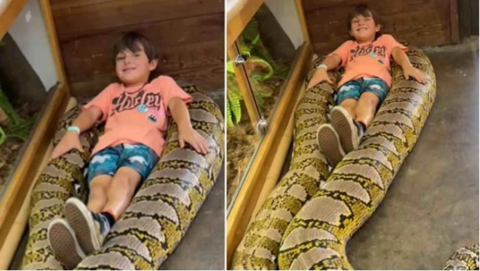 विशाल अजगर की पीठ पर बैठा बच्चा 2 साल का बताया जाता है। वह अपनी जीभ भी बाहर निकालता है और एक बार बच्चे को देखता है। उस पल को देखकर आपके दिल की धड़कन तेज हो जाएगी।