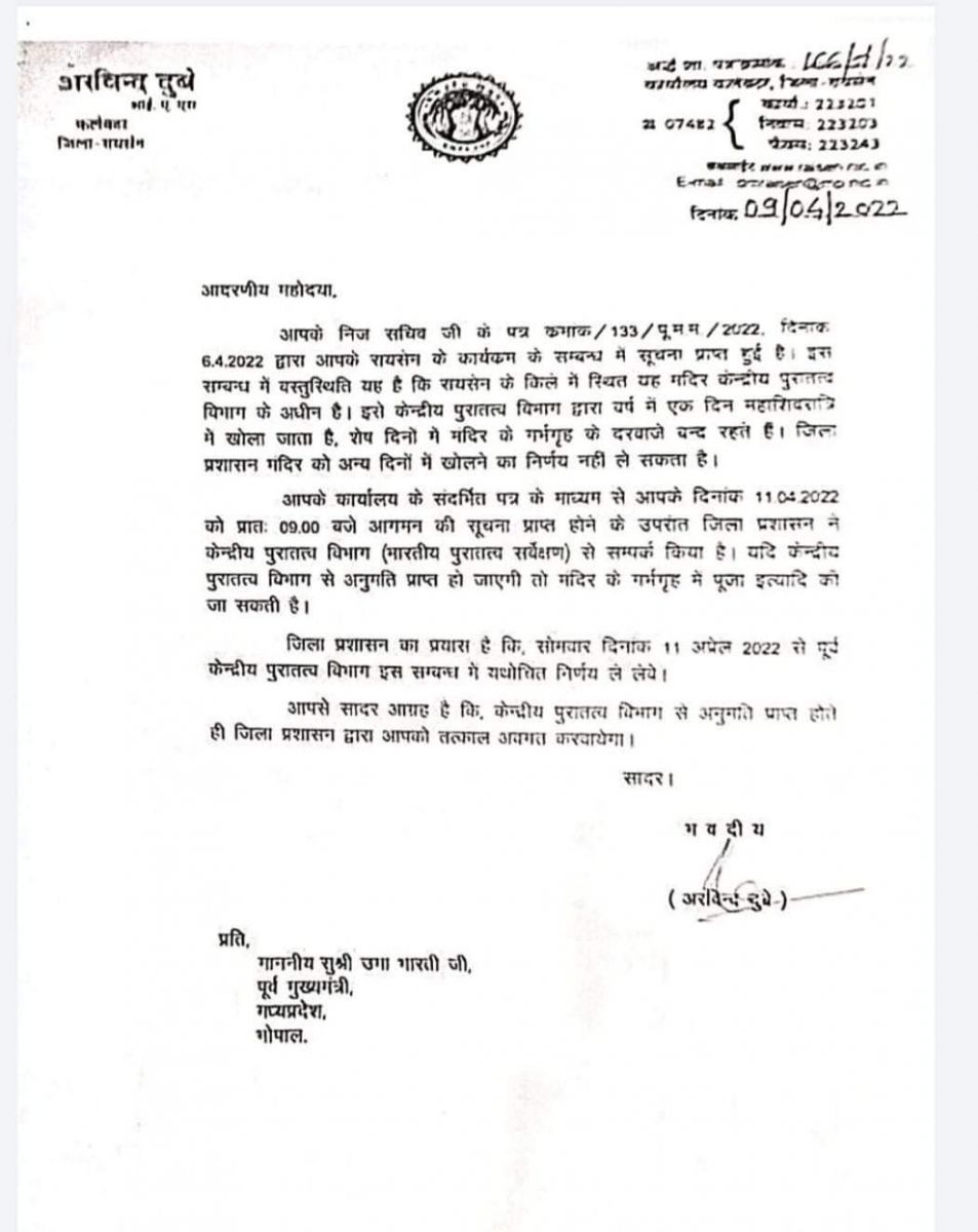 उमा ने रायसेन किले के मंदिर में की पूजा, सोमेश्वर महादेव की गेट के बाहर से की पूजा..! उमा बोलीं- हम ताला खुलवाना चाहते हैं, तोड़ना नहीं, जब तक ताला नहीं खुलेगा, तब तक के लिए मै अन्न त्याग रही हूं..!#MPNEWS #UMABHARTI pic.twitter.com/hxABp7I8Cs